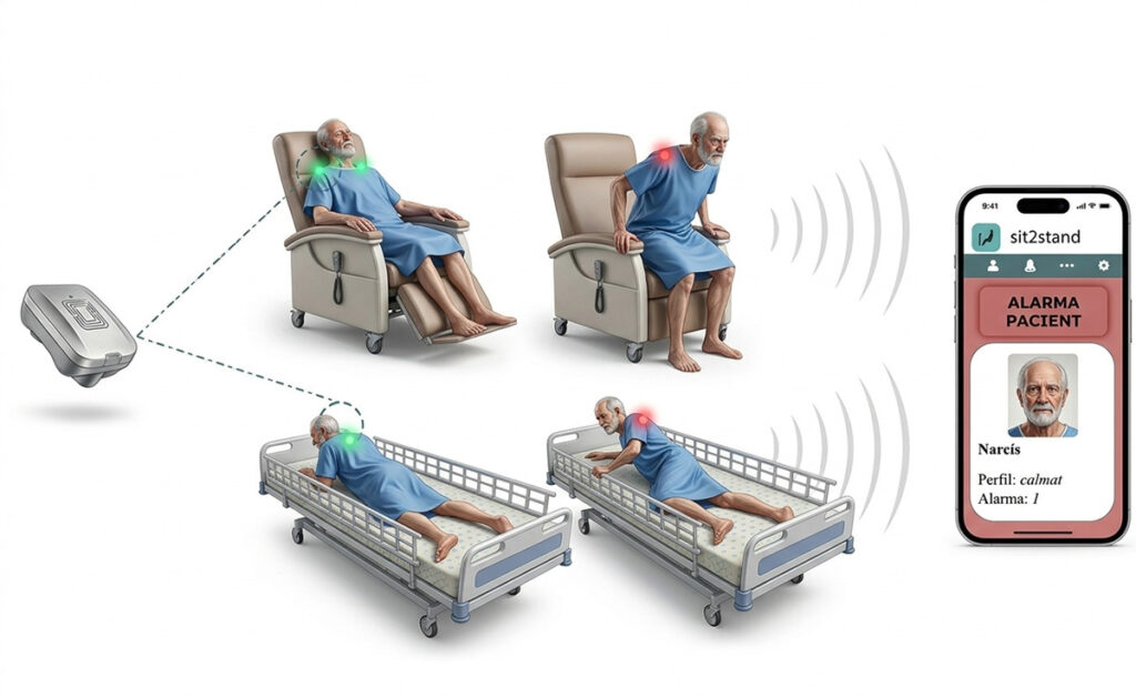 El dispositivo Sit2stand se coloca en la espalda del usuario, detecta los movimientos de riesgo y envía un aviso de alerta a un dispositivo externo, facilitando que la persona cuidadora intervenga a tiempo y evitando la caída.